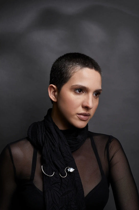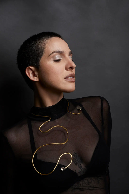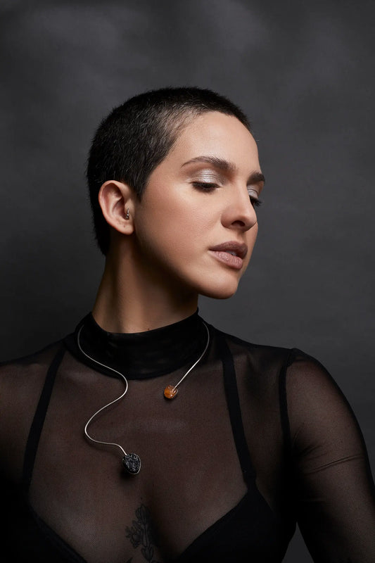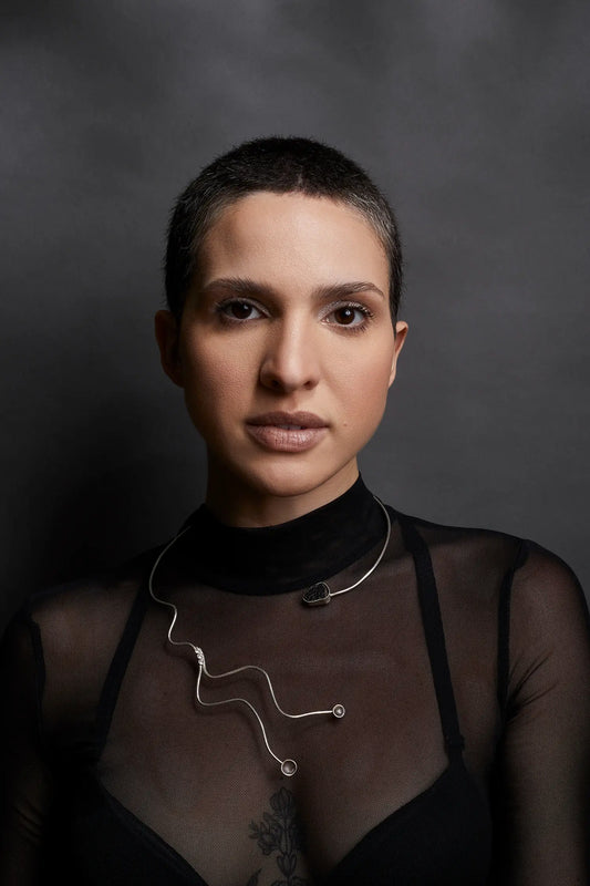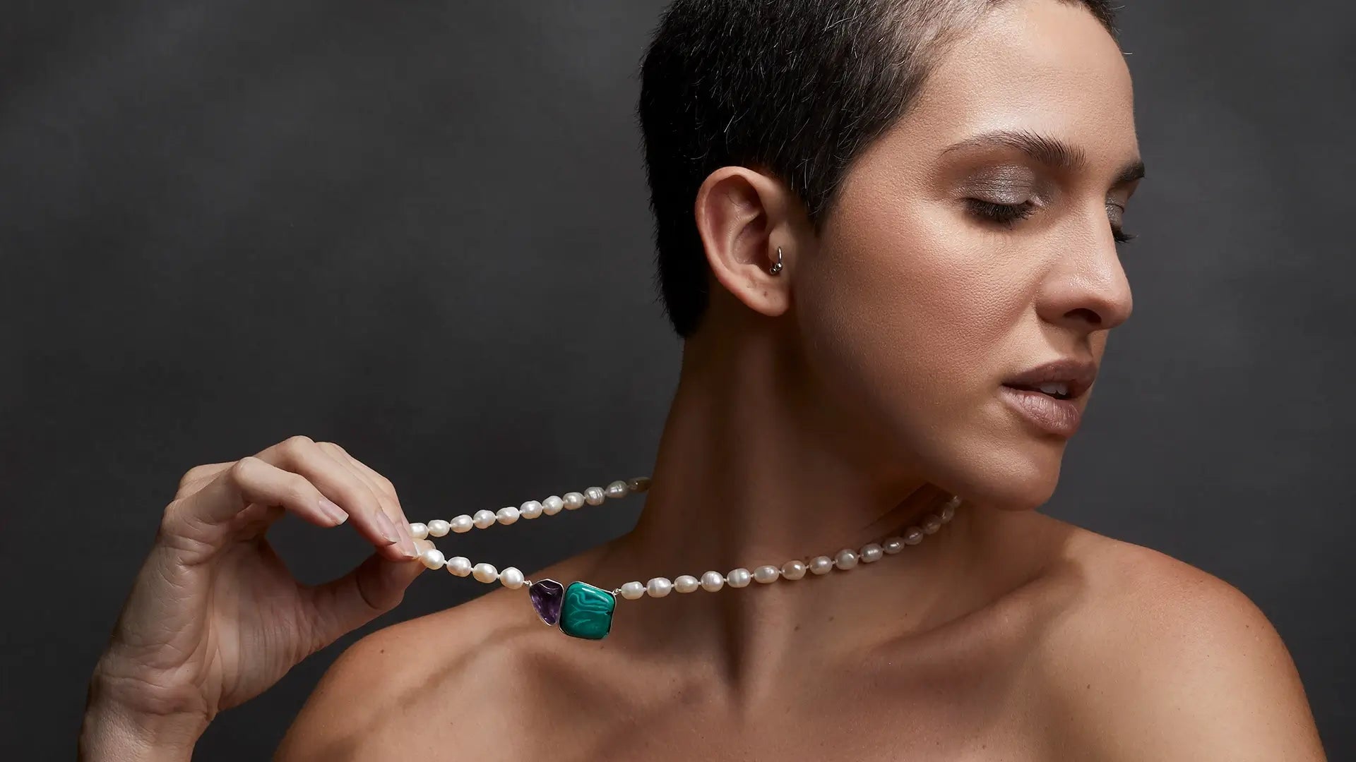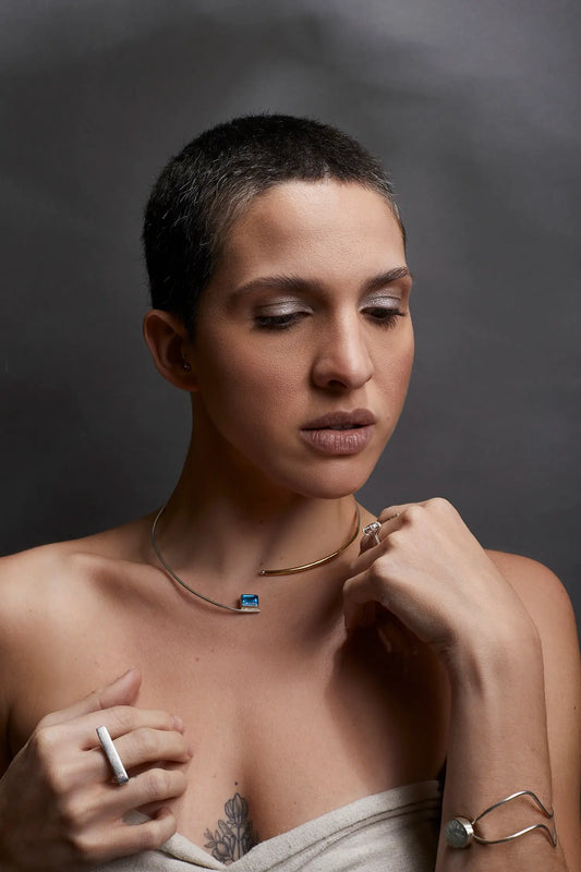 Uma forma diferente de manusear os fios de prata surge em seu processo criativo, junto com o uso de pedras brasileiras lapidadas e brutas. Em curvas e formatos únicos, a busca pela simplicidade, beleza e ousadia.
